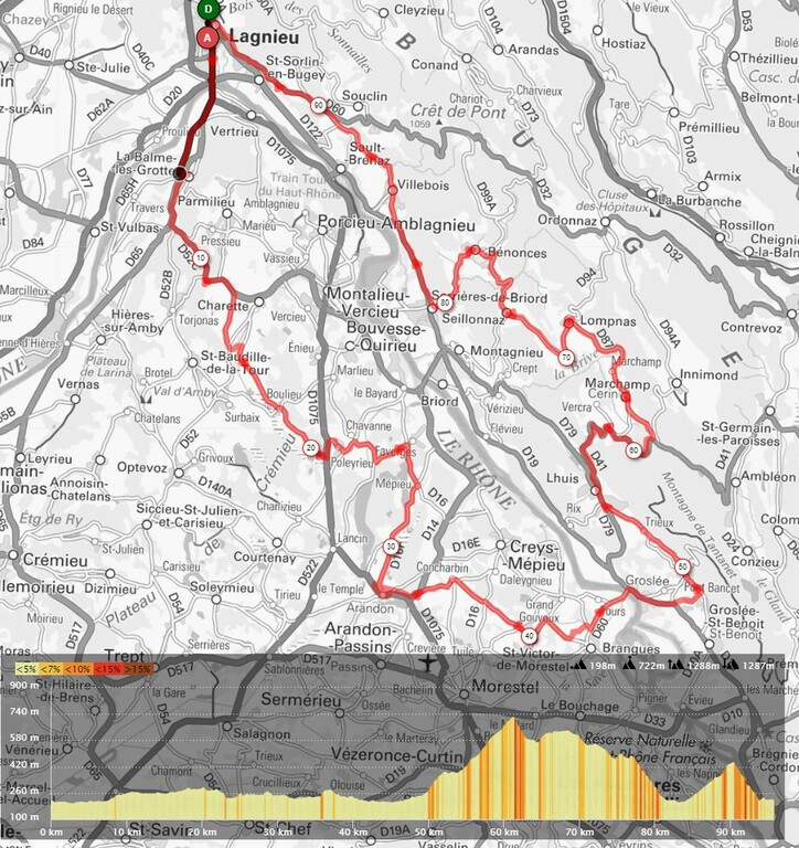 RV devant l'église de Lagnieu à 8 H15 pour un départ à 8 H30, une randonnée de 95 Km avec 1300 m, pique-nique tiré du sac